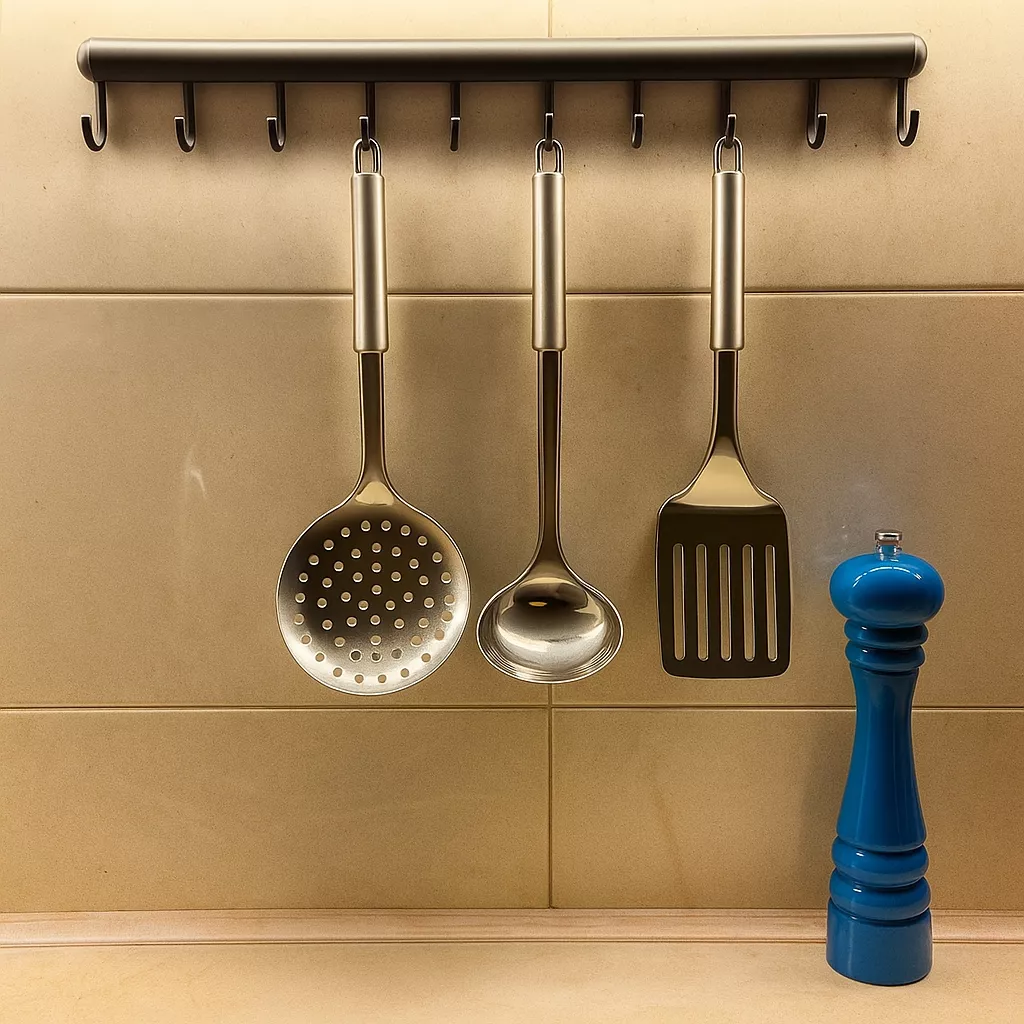 Dzięki oczkom na końcach uchwytów możesz łatwo zawiesić swój zestaw przyborów kuchennych do kuchni na relingu, zachowując porządek i styl.
